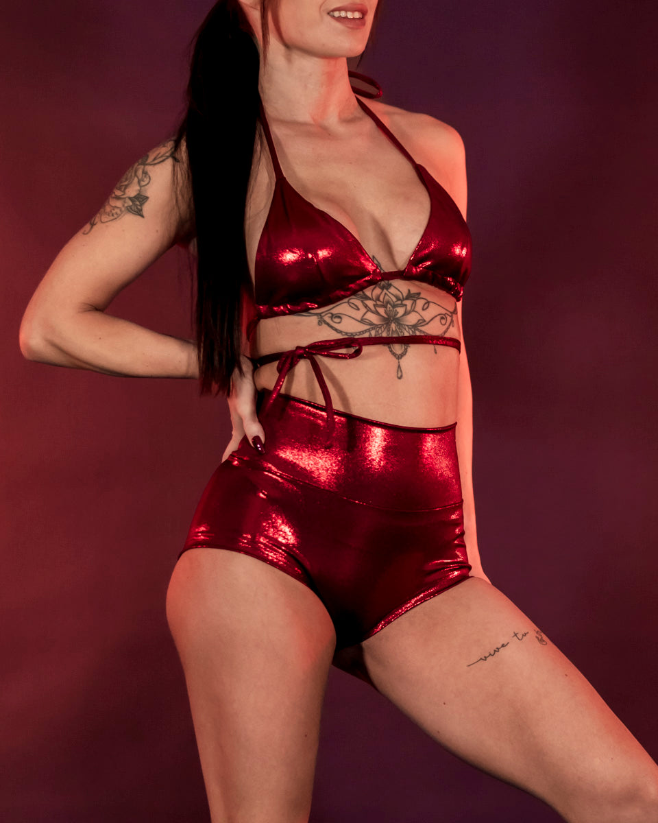 Booty shortsi on sivu- ja etusamaton malli, joka on suunniteltu vastaamaan erityisesti twerk tanssin lajivaatimuksia. Cranberry shimmer on näyttävä kangas; yhdistämällä tuotteen mesh tuotteidemme kanssa luot upean lookin.
