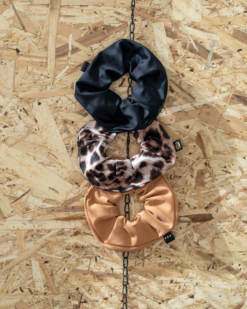 Kaunis Chichilla paketti sisältää kolme muhkeaa scrunchieta: Leo-kuosin, mustan velvetin sekä karamellin värisen donitsin. Scrunchiet ovat valmistettu Lahdessa. Yksinkertaisena scrunchie koristaa kauniisti nutturaa, mutta sitä voi käyttää myös kaksin- ja kolminkerroin.