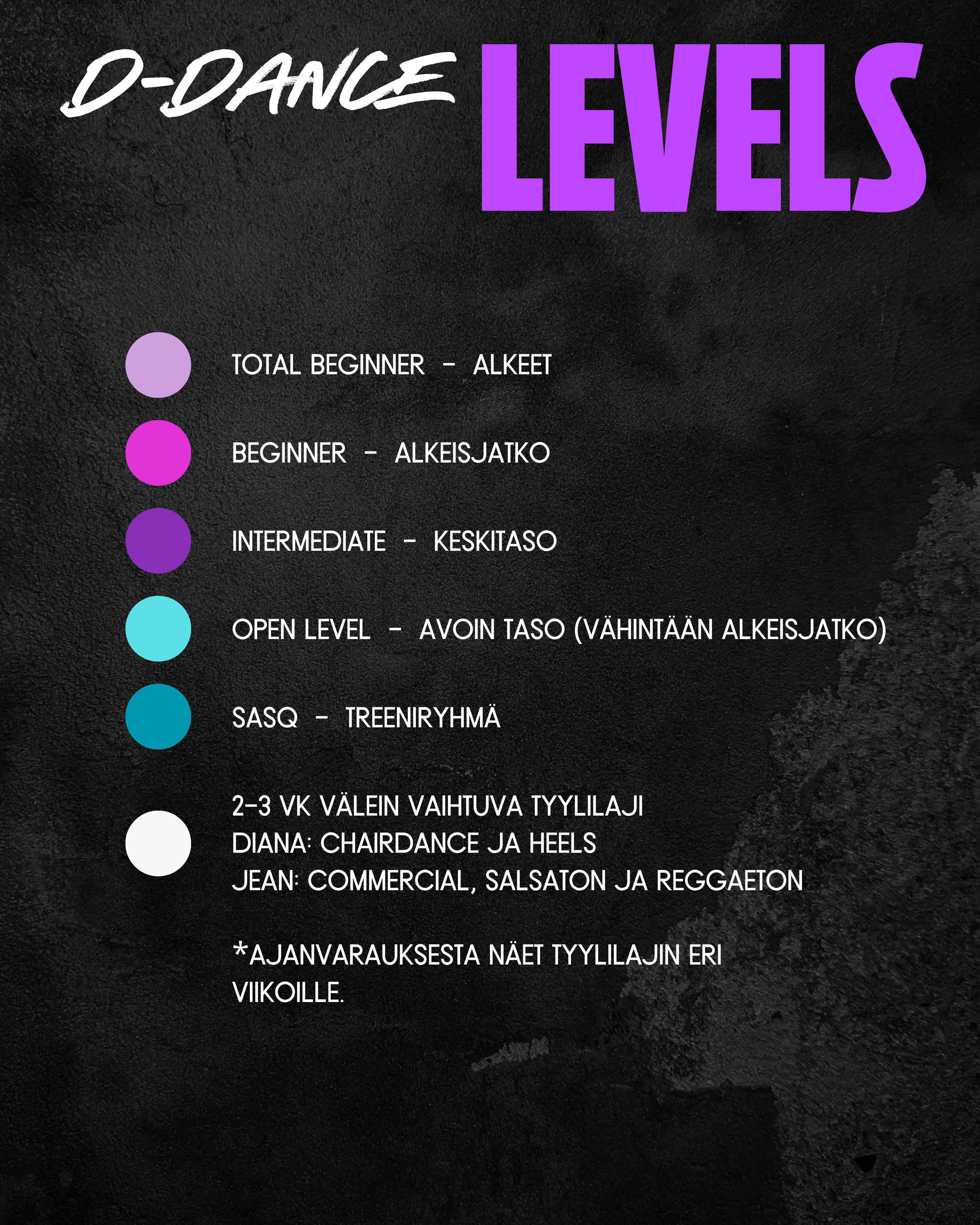 Intermediate: Tunteja ei suositella täysin aloittelijoille, mutta oikealla asenteella myös aloittelijat hyppäävät mukaan näille tunneille. Intermediate tason tunneille koreografiat ovat jo haastavampia sekä keskitymme syvemmin ilmaisuun.