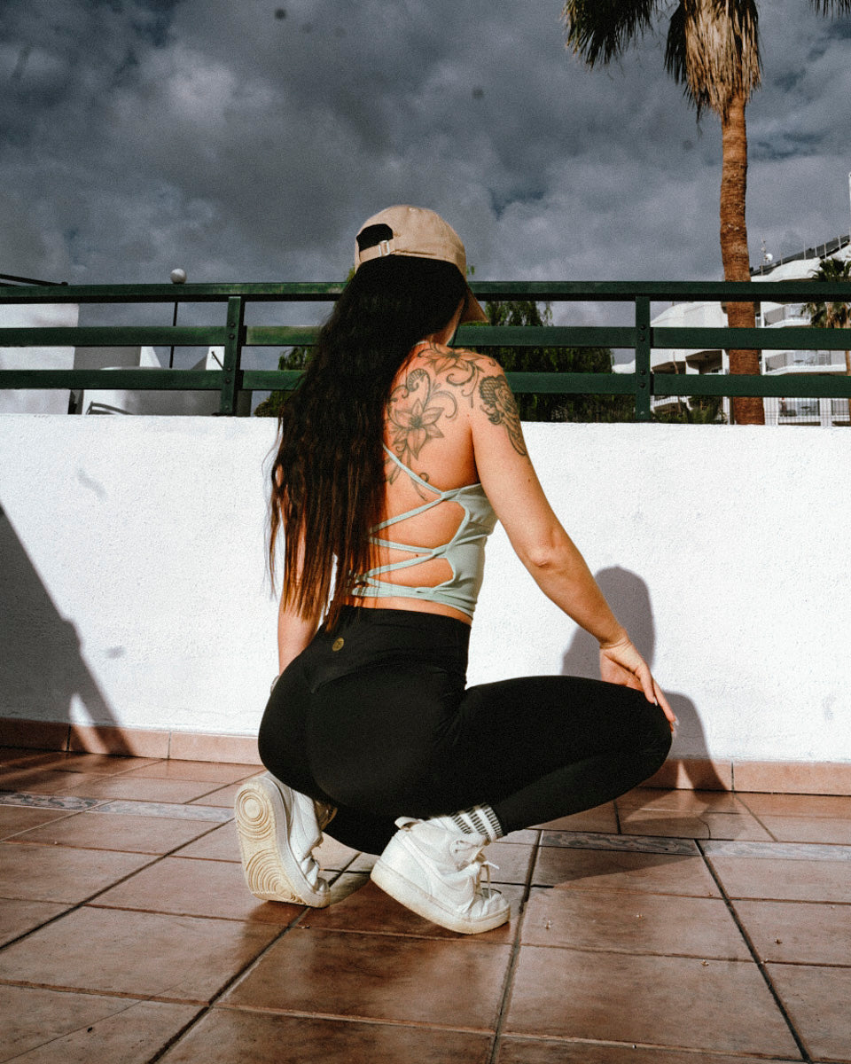 Kaksinkertaisesta kankaasta valmistettu Leana strap top on kauniisti viimeistelty ja mallissa on kolme lenkkiä selässä nauhoille. Upea huurteinen Frozen Matcha sävy, jossa on kauniisti muotoiltu edestä syvempään uurrettu pääntie.