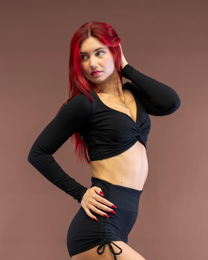 Saga Twist Shirt on valmistettu joustavasta rib materiaalista, joka on erittäin miellyttävä käytössä. Ribbi on tyylikäs valinta niin liikuntaan kuin vapaa-aikaankin. Kangas on todella miellyttävä ja kevyt, soveltuen täydellisesti myös tanssiin. Vasemmassa hihassa on kaunis kudottu DB kangasmerkki.