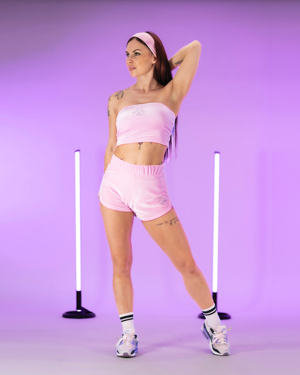 Viola Velvet Shorts ovat näyttävät ja mukavat shortsit tanssiin, treeneihin ja vapaa-aikaan. Pehmeä pastellinvaaleanpunainen samettikangas antaa shortseille ylellisen ilmeen, ja kankaan hienostunut pinta heijastaa valoa kauniisti liikkeessä.